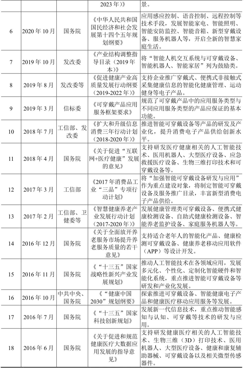 智能可穿戴設(shè)備行業(yè)作為國家鼓勵和支持的產(chǎn)業(yè),近幾年來, 相關(guān)政府部門先后出臺多項產(chǎn)業(yè)政策支持和鼓勵其發(fā)展。涉及的主要產(chǎn)業(yè)政策 如下表所示:
