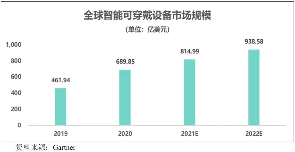 據(jù) Gartner 預(yù)測,到 2022 年全球消費(fèi)者在智能可穿戴設(shè)備上的支出合計可達(dá)到 938.58 億美元,較 2019 年將增長 476.64 億美元,三年間實(shí)現(xiàn)近 100%的增幅。