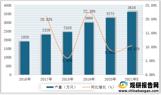 2016-2021年我國智能水表產(chǎn)量、增速及預(yù)測(cè)