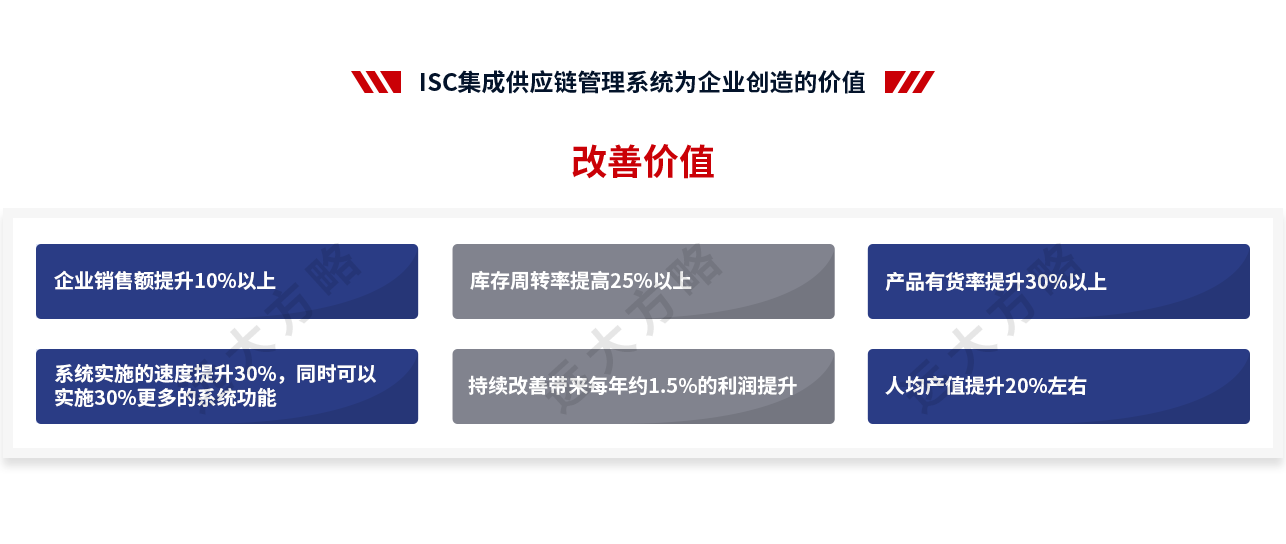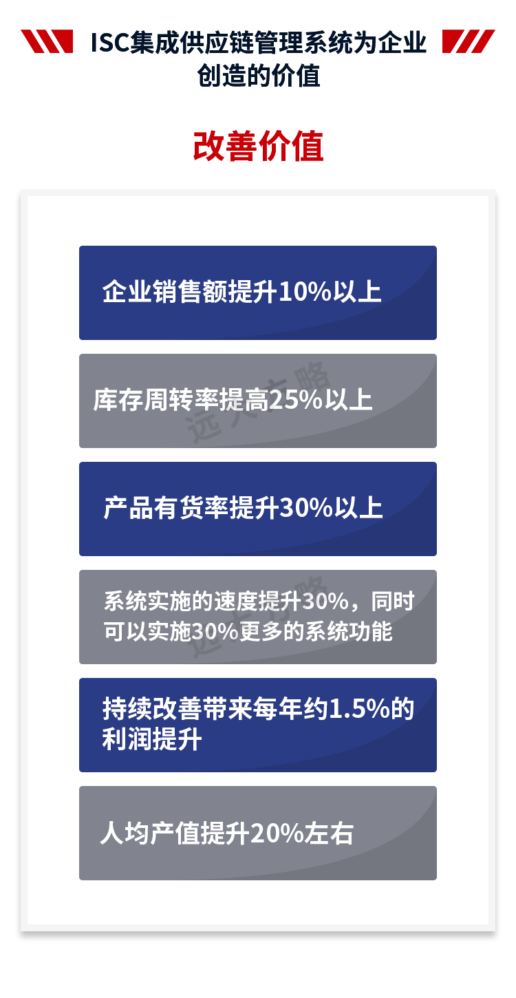 3、數(shù)據(jù)增長:打造高效供應(yīng)鏈咨詢項(xiàng)目,通過提高交付的可靠性與靈活性,提升客戶的滿意度;通過降低庫存、減少生產(chǎn)及分銷的費(fèi)用,降低公司成本;通過流程優(yōu)化、消弭異常事件,提升企業(yè)整理的流程品質(zhì)。實(shí)現(xiàn):人均產(chǎn)值提升22%,訂單交付及時(shí)率提升33%,供應(yīng)鏈周期縮短21%,庫存周轉(zhuǎn)速率提升23%,供應(yīng)鏈響應(yīng)速度提升32%。